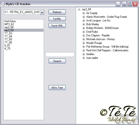 Nah ennek is eljött az ideje. Ingyen szoftvet teszek az internetre. :) Nem nagy dolog, és több továbbfejlesztési lehetősége is van, de legalább használható. (végülis az a 4-5 óra amit egy éjszaka belefeccöltem, nem sok...)Úgy kezdődött, hogy vagy 10 évvel ezelőtt használtam a WhereIsIt nevű csodát. A CDimet benne tartottam figyelemmel, hogy melyiken mi van. Aztán nem használtam a szoftvert, mert nemérdekeltek aCD-k. Most meg keresek valamit, de szoftvert lopni, meg feltörni meg kódot szerezni hozzá meg nyaff. Irok egy sajátot ...szameg. Ez volt este 10 körül. :) Egész hamar elkészült. Kábé mire elálmosodtam. Eddig ennyire jutottam. Folyt köv. Várom az épitő javaslatokat, fejlesztési 5leteket, hibákat. tuti hiányzik a - file megnyitás és igy a file csere lehetősége. - rendezhetőségUser manual: Refresh gombbal frisiteni lehet a legördülő izében a CD driveok listáját. (Csak azok látsznak, amiben van CD/DVD!) ToXML beolvassa a CD-t. a saveXML elmenti a beolvasást. (Nem, ez direkt nem egygombon van:) ) a search feletti dobozbairva kereshetünk az egész adatbázisban file és könyvtárnévre. All to Tree gomb az összes CD tartlamat betölti jobb oldalra.Telepités: másold egy könyvtárba és inditsd el. ide fogja tenni az adatokat is egy másik fileba. ps: a szoftver...