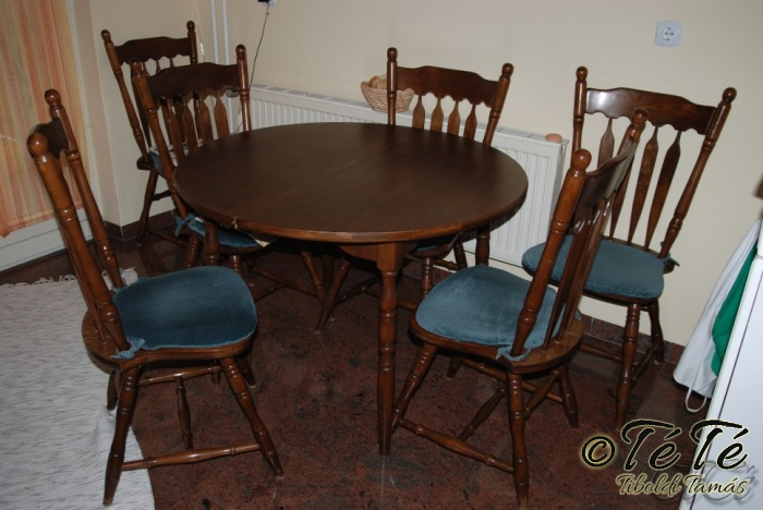 EladóValódi fából készült, kinyitható kerek asztal, 6 székkel.Az asztal lapja 110 cm, mely oválissá nyitható ki.Érdeklődni a szerkesztőségben.