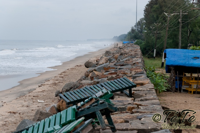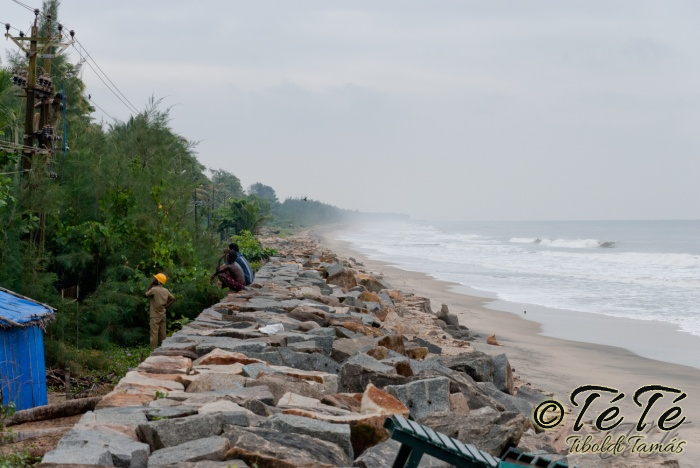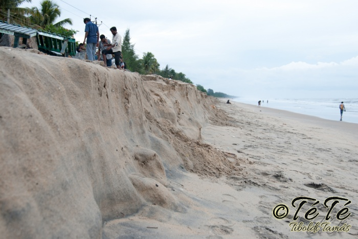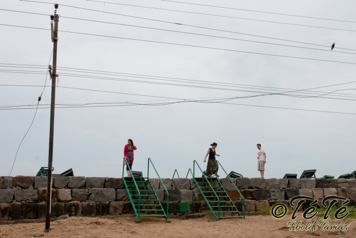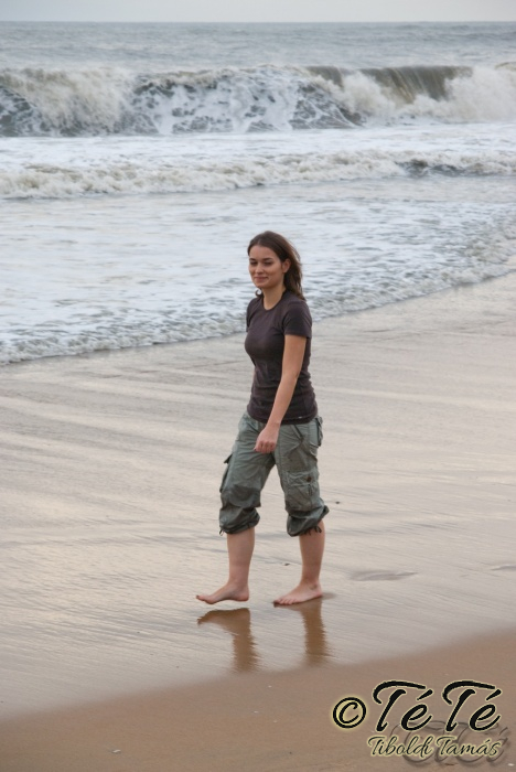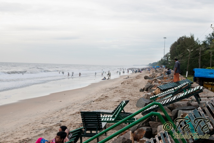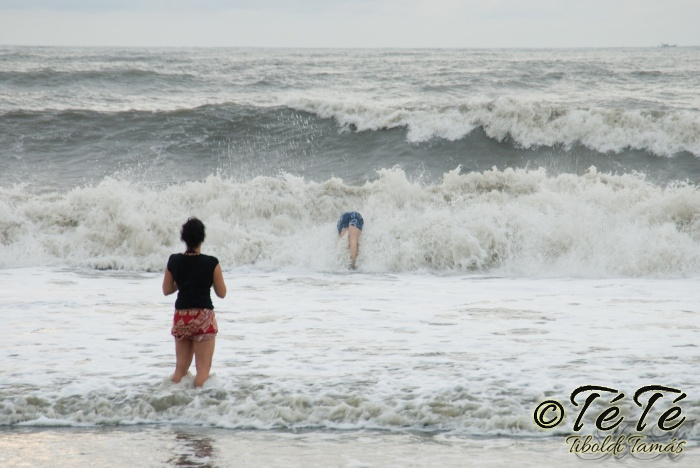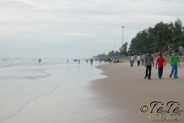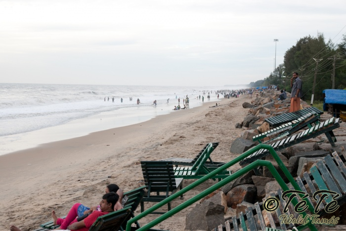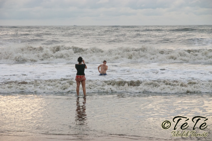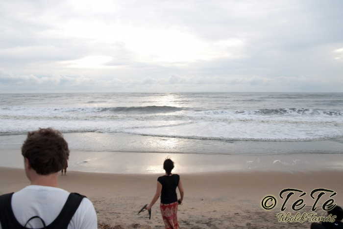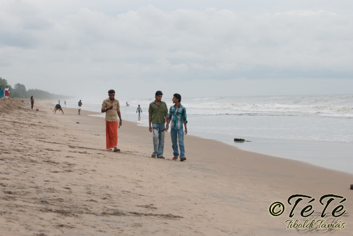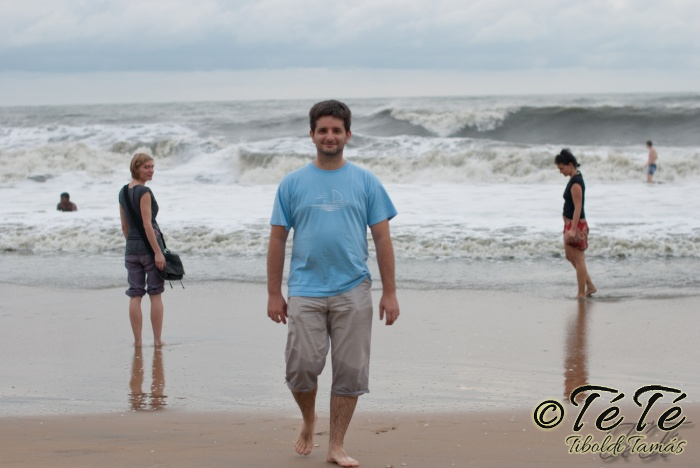 Szobák elfoglalását a strand megrohamozása követte. SZállodából kilépve egy lépcső megmászsása után elénk tárult az Indiai óceán. Szerintem pont olyan mint más homokos tengerpart, nagy hullámokkal. Az eddig ismert tengerpartokhoz képest az volt a különbség, hogy itt nem sokan fürdőztek. Sokan voltak a parton, de mondjuk azoknak a harmada-fele fürdött, a fürdőzők 99,5%a férfi volt, többségük pólóban, rövidnadrágban. A nők csak lábszárig mentek a vízbe, de szárijukat ekkor sem húzták fel. A vízből csak pifu fehér teste világított ki néha. Látványosság továbbra is voltunk :)Ezzel el is ment az este. Fotóztam, sétáltunk kicsit Andival, aztán vacsi.