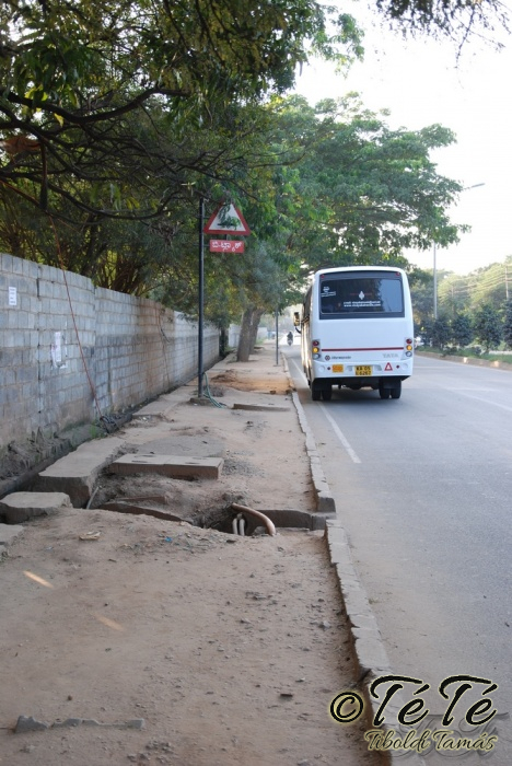megyünk a járdán. Egész jól szituált jártda, viszonylag kevés lukkal, a csatornák fedelei is a helyükön vannak. Alacsony fák vannak középen, de a 2-3 méter szélességben ki tudjuk kerülni őket, akárcsak a belógó elektromos vezetékeket is. kellemesen sétálunk, beszélgetünk. Mellettünk az úton autók, buszok, kétkerekűek. kerülgetik egymást, dudálnak hozzá. Szóval minden rendben. Még attól sem félünk, hogy feljönnek hozzánk, mert a járdák kb 40-60cm magasan vannak az úthoz képest a motorosok miatt. megyünk megyünk. Egyszercsak, minden átvezetés nélkül a járda megszűnik, betonfal. 4 "sávos" út nincs ember aki átmegy rajta, maradunk itt. A fal mellett van még kb 60-80 cm hely, egy embernek elég. Vagy egy motornak. vagy egy fél autónak. mi azt választottuk, hogy elférünk, látszólag ezt a motorosok is elfogadták, és nem löktek fel minket. Amikor megállt a sor jobbnak láttam megállni, és hagyni had küzdjenek motorosaink a helyért, majd köztük elsétálni. Visszafelé viccesebb, akkor szembe jönnek :)