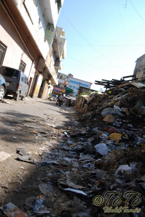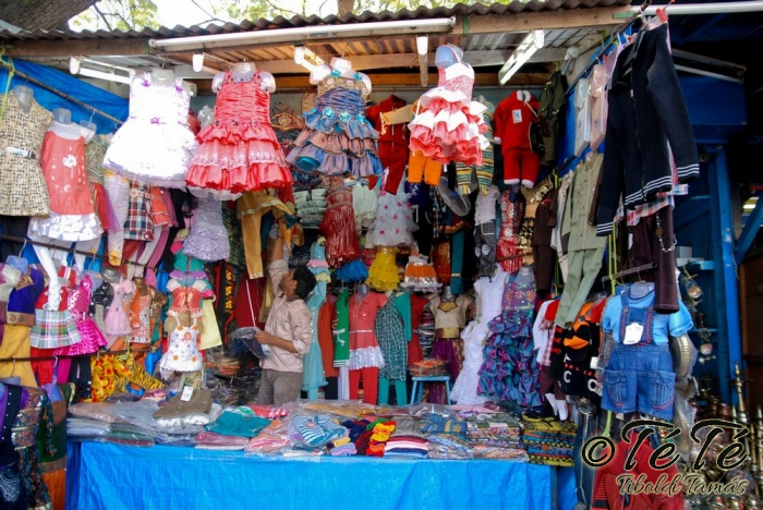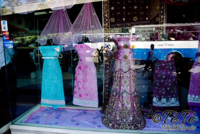 Vissza az utcára. Hihetetlen az, ahogy a vastag falak megfogták a kinti zajt. Amikor kijöttünk, nagyon hirtelen és nagoyn hangos lett a világ. Jó, tudom itt mindenhol hangos, de pont ezért volt jó a csendes udvar, és még erősebb érzésű a zaj. A járdán továbbhaladva árusok mellett mentünk el, akik a járdán ültek, kis lepedőikről árulták a portékát. Zöldésg, gyümölcs, és bármi más. Tök jól nézett ki, ahogy a krumplit 3-4 emelet magas piramiskoba rakták. (akárcsak a narancsot, és hasoló kerek zöccségeket. Az ehető dolgok után egyszercsak egy bugyi és alsónadrág árus szines dolgait láttam a földön. majd megint zöldség meg valami szörme, aztán bizsu. Az árusok kitartóan ülnek törökülésben és szivesen segitenek az érdeklődöknek. :) Aztán már Bódék jöttek. Szép sorban, tiszta kinai piac jelleggel. Elférni már nem annyira fér el az ember, de nem az a lényeg. Táska, Ruha minden mennyiségben. A kedvencem a kislány ruha boltok voltak. Mielőtt még valaki elkezdene kombinálni, azért tetszettek, mert ezek nem normálisak :D Kislányokra olyan csillogós, fodros, színváltós hosszú, rövid, pántos pántnélküli ruhákat adnak, hogy az elképesztő. Jobb cirkuszbana bohócoknak nincs ilyen csiricsálé öltözéke. És igen, sok kislányt láttam ilyen ruhákban. SZerintem az anyukák itt élik ki elfolytott ruházkodási váagyaikat. Egyszerre, egy ruhába zsúfolva mindent akár :) A piac-járdáról a kijutás csak egy 160 magas kerítésen keresztül lehetséges, ott is csak azon a helyen, ahol már kiszedték a rácsokat, hogy ki lehessen jönni...