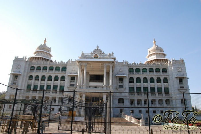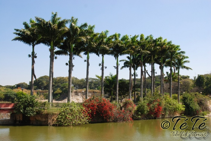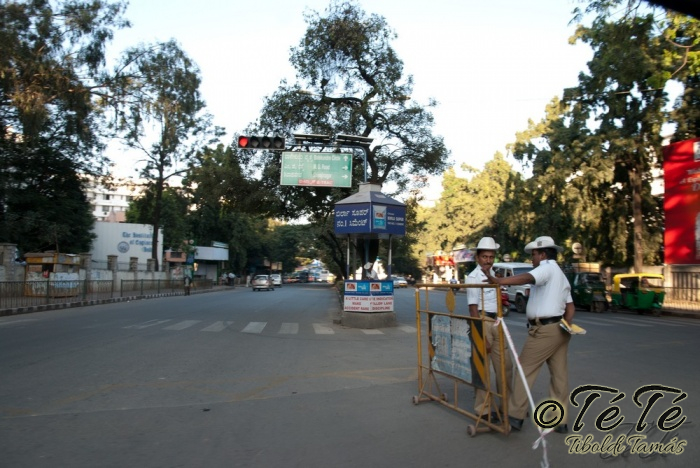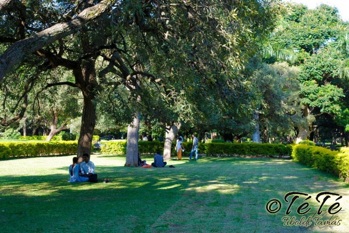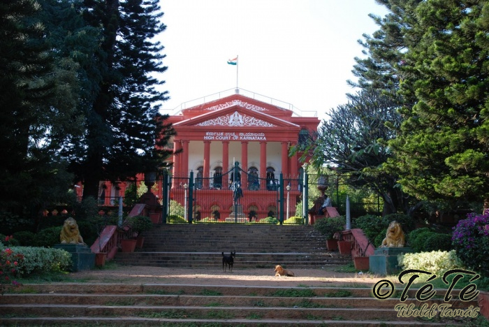 Nagyon jól esett a hirtelen támadt csend, amikor beérünk a park kapuján. Tényleg nem tudom, hogyan csinlálják, de biztos valami csend-kapu is van, ami kinn hagyja a hangzavart. Ez nem annyira városliget szerű park, mint inkább valami, amin néha keresztülmehetnek az autósok, de egyébkét az utak között fű-fa-virág van, elkerítve. Itt leültünk enni, meg kóricáltunk. Találtunk szép helyet, mint a zenélő kút a Margitszigeten, csak nem zenél és nem kút. :) Meg megtaláltuk a Bangalori legfelsőbb bíróság épületét is. Vicces kis öltönyös indiaiakkal :) Ami ebben a parkban volt igazán feltünő, hogy a párok hogyan vieslkednek romanitkázáskor. Voltak, akik csak szorosan -értsd amenynire két ember emgymá mellé tud zsúfolódni- ültek egymás mellett, de kezüket véletlen sem összeérintve. Voltak, akik ültükben már kéz a kézben voltak. de voltak akik mint otthon a fiatalok feküdtek, ültek és beszélgettek, mit sem törödve, hogy összeér a lábuk emg a kezük is egyszerre. :) Kézenfogva sétáló párt alig láttunk. Kikéve, ha fiú-fiú vagy lány-lány pár volt. azok minden gond nélkül. még nem derült ki, hogy haveri alapon vagy szerelemből sétálnak kézenfogva. :)