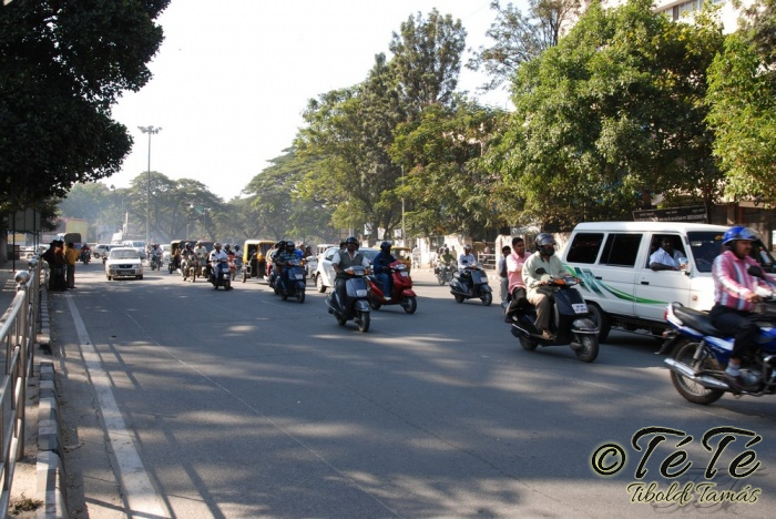 Ott tartottunk....jah igen. leszálltunk a buszról. Álltalában ha csak leszálló van a busz nem áll meg, csak lassít szabályt próbálják követni. vicces. nem. A tervet követve el kell sétálnunk az egyik parkig, nevezzük nevén: Lal Bagh. Az odavezeto úton megtapasztaltam milyen is az indiai gyalogosok élete. Élete? élet-halál harca. Térkép szerint kb 1,5 km-t mentünk. Néhol volt járda, néhol nem. Ahol volt, ott a szokásos 40-50-60 cm magasra kell felmászni, leugrani. ahol nem ott figyelni kell, hogy a mögötted jövo autós, motoros, busz vajon azért dudál mert ot elozik vagy azért mert o eloz vagy azért mert téged kerül ki ....(nem, sose kerül) vagy azért, mert téged figyelmeztet, hogy az útjában vagy. SZóval nézel elore, mert ott vagy kátyú van vagy kutya vagy ember...vagy tehén. közben nézel hátra is a már emlitett jármuvek miatt. közben azért jó lenne az "üzeltekbe" is benézni. Befotózni nem merek nagyon, ki tudja megvernek-e vagy sem. Üzletek... sok gumist, meg motorjavítót láttam. Motorjavító üzem akkora, hogy a motor épp befér. vagy nem mindig. A gumis se sokkal nagyobb. Ami szokatlan nálunk ahol tél is puszít idonként az az, hogy az üzleteknek nincs eleje. Nem az, hogy kirakat és oda tesznek dolgokat, hanem simán nincs fal az utca felé, látod a teljes készletet. Ahogy néztem hátsó helyiségek se nagyon vannak, legalábbis oda vezeto ajtó vagy ajtó-hely sem volt. De ez nem csak a szervizekre igaz, hanem mindenre. Hentes, zöldséges, textil, kisgép, nagygép, létra bolt. Az életért való küzdelem része az úton való átkelés is. Zebra fogalma szeirntem a kreszben sincs leirva, a közlekedési lámpáé szerintem csak téjékoztató jellegu szabály. Ezek miatt az átkelést a már kicsiben ismert menj-amikor-tudsz-és-engedj-el-minden-erosebbet elv alapján kell megvalósítani, ami mondjuk egy 6 "sávos" útnál nem egyértelmű...