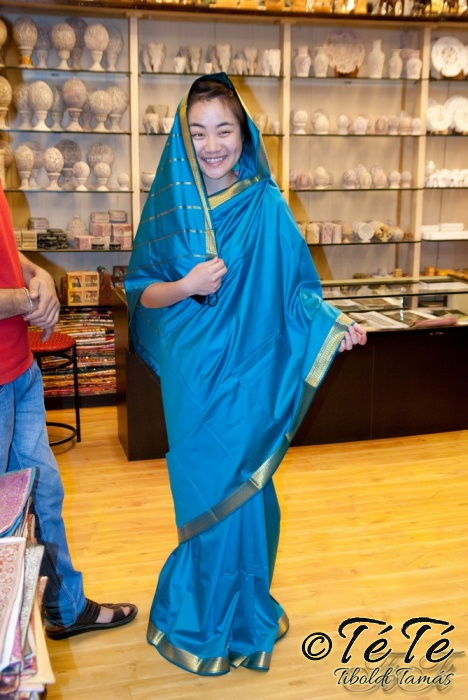 Bácsi beszédes taxis, löki a szöveget. Azon kapom magam, hogy beleegyeztünk, hogy elvisz két boltba, ahol nézelődünk, é meg kap benzinpénzt a boltostól. Gyanúsan átverős a dolog, de mindenhol van ilyen túrista átverés, nem kell venni semmit, max majd tényleg nem veszünk. Lezsirozva, minden oké. Első bolt. szuvenirek, ékszerek, akármi. hátramegyek, ha már itt vagyunk, felderitem mit rejt a bolt, mert a suvenir izék nem hatottak meg elsőre. majd kifelé... Hátul egy kinai-vagy-egyéb-ferdeszemű :) csapat (3fő) nézeget anyagokat. Jön az eladó vigyorogva, hogy Helló, namikéne? Kérdezésbe még kevesen halltak bele boltban, "mennyi a szári?" "ó szári van sok, milyen kell? 900". "Há' mutassá'. mondjuk kék van-e?" Leveszi, mutogatja, tapogatom. textilnek textil, de gyanúsan kicsi. "Barátom, oszt ezt hogy kell viselni, megmutatod-é?" hangzék fel kérdésem, mire válaszként már a csikbanlátó kislányt kiszemelvén áldozatul öltözteti fel száriba. Szerenécsre pont abba a kékbe, amit kiszemeltem, így tuti, hogy látom nem átverés-e, és szárit lehet csinálni abból a darab anyagól. Magyaráz, nevetgélünk, fotózkodunk, és egyszercsak ott áll a kislány egy kék száriban. Mondom, ez menő. :) boltban 2-3000ért láttam eddig, a 900 nem annyira rossz. még úgy sem, hogy feslik a széle, de láttam, hogy el van varva fél centivel a széle mellett, a feslés majd megáll. Olyan gyakran úgyse hordom ;)...izé hordja majd Andi. Nah mondom, akkor az átverés működött, "jólvan, addide, elviszem". Amig becsomagolja kislány felirja nekem az e-mailjét, küldjem majd át a képeket, fizetünk, azt kijövünk.
