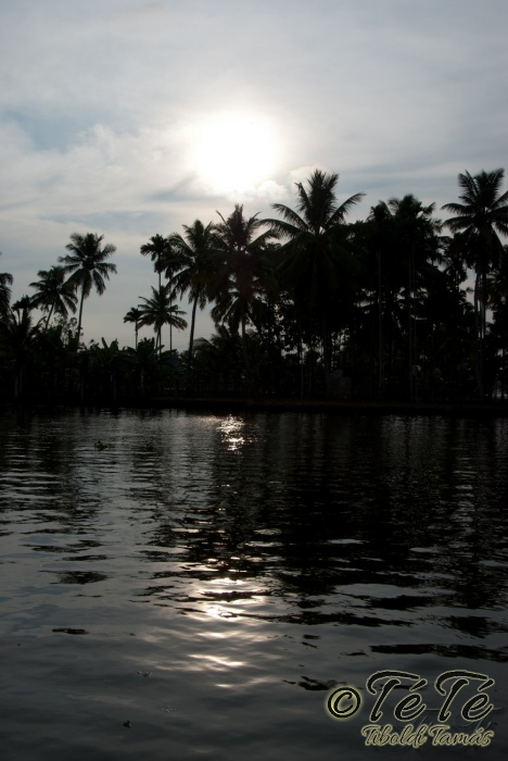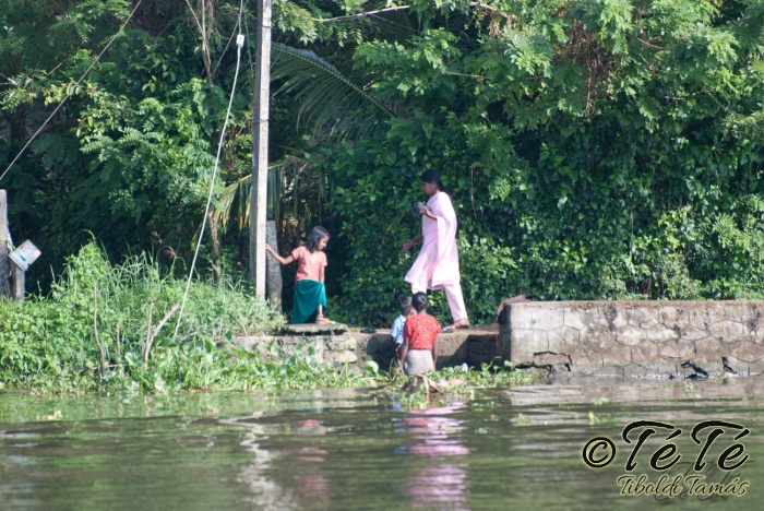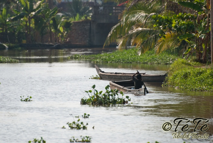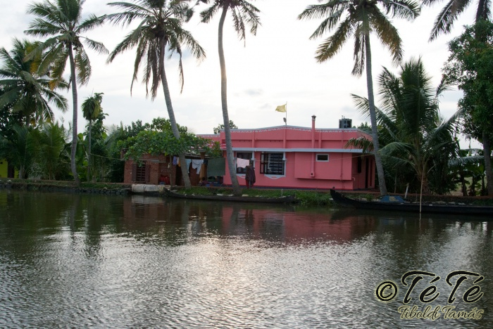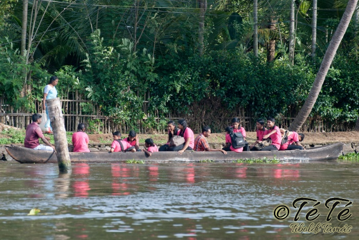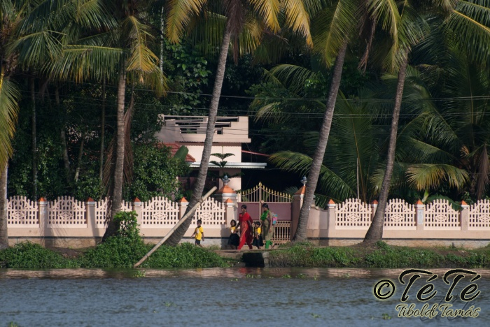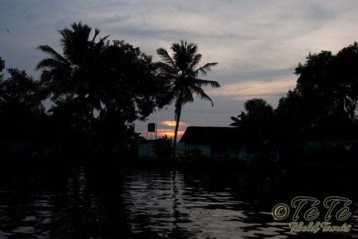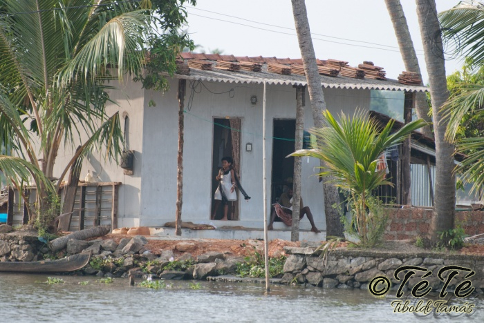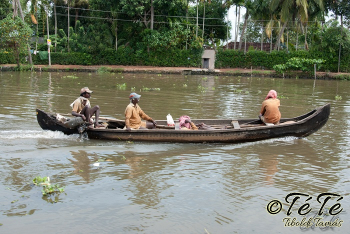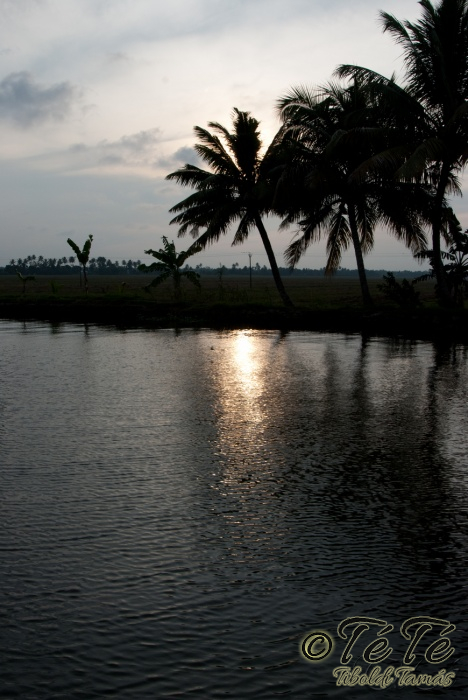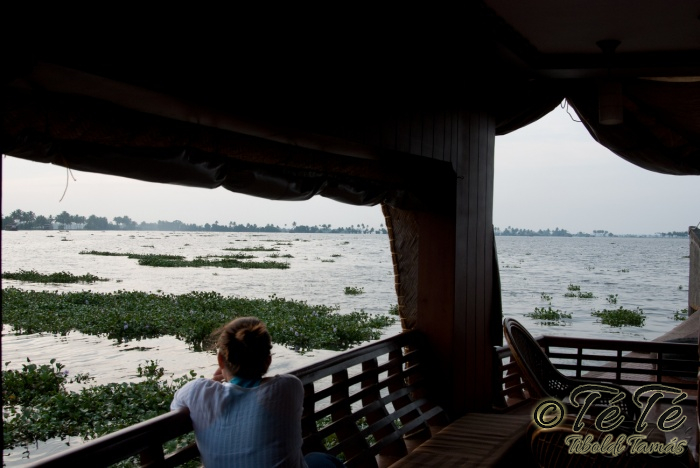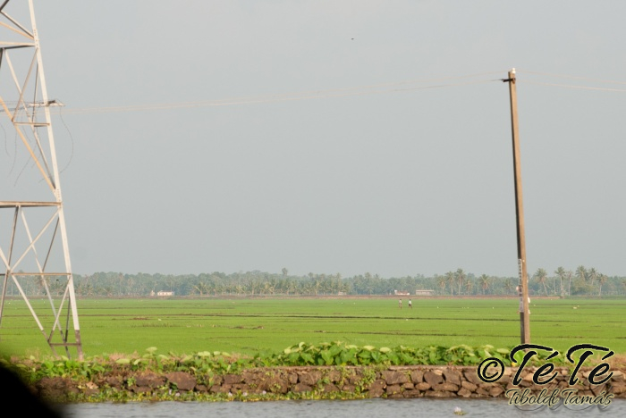 Ahogy elindultunk -és sikeresen kiálltunk a 3 sorban egymáshoz kötött hajók közül- tisztára Poirot érzése volt mindannyiunknak. Poirot, halál a Níluson. Reménykedtünk, hogy reggelinél nem kell majd nyomozni, hogy ki tünt el :) Már nagyjából ismert közegben hajzótunk, a tegnap megismert csatornarendszer vastagabb ágain, tavain. Ebédhez kikötöttünk egy rizsföldön, melyet mivel nem pisiltem körbe, nem nevezüünk TéTéföldnek. De azért ebéd után át tudtam érezni gyarmatosítóink sanyarú sorsát, amikor a rabszolgák hozták a kaját és ők meg csak rámutattak a földre, hogy "Ezt gyarmatositsd". Ebédnél rájöttem, hogy ha akarnak, tudnak főzni. Nem csípsen kértük a kaját és annyira finom volt, hogy csak na. Ebéd után szindítottunk, nézelődtünk, fotóztunk, integettünk, beszélgettünk egész vacsoráig, amit hasonló program követett. Vacsihoz való kikötés után már nem indultunk tovább, ott töltöttünk az éjszakát. így láttuk azt, hogy a partvidék lakói a hazajutáshoz este kénytelenek elemlámpát, telefont, bármi világító eszközt igénybe venni, mert közvilágítás nincs. Nemsokkal az után, hogy megszoktuk éjszakai szálláshelyünk és a szomszéd houseboat-okat, elkezdett cseperegni az eső, majd villámlott, és vihr lett. Jó volt a fedett hajóból nézni az esőt és a folyót. Pláne, miután egy villámlás következtében csak a houseboat-ok világitása maradt meg, mindenhol máshol áramszünet lett... (a kisebb nagyobb áramszünet Kerala megyében elég megszokott a nap bármely szakában)