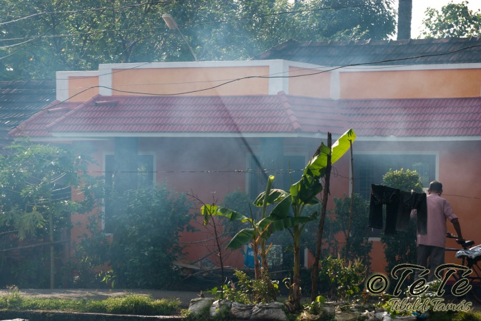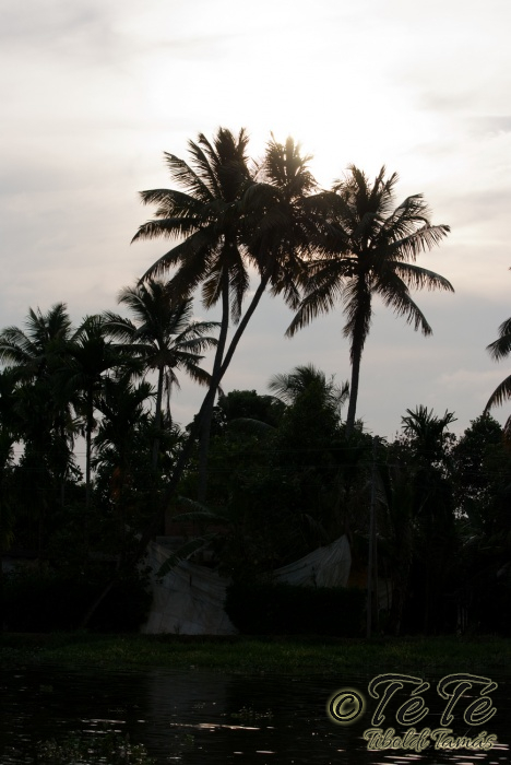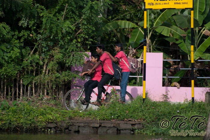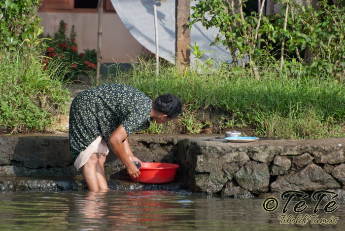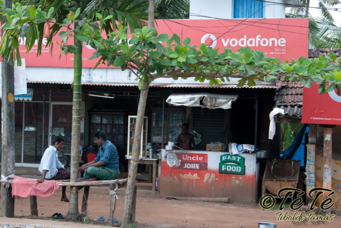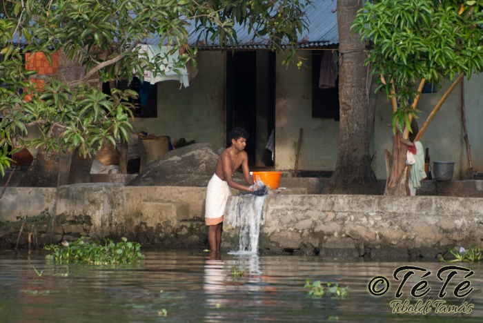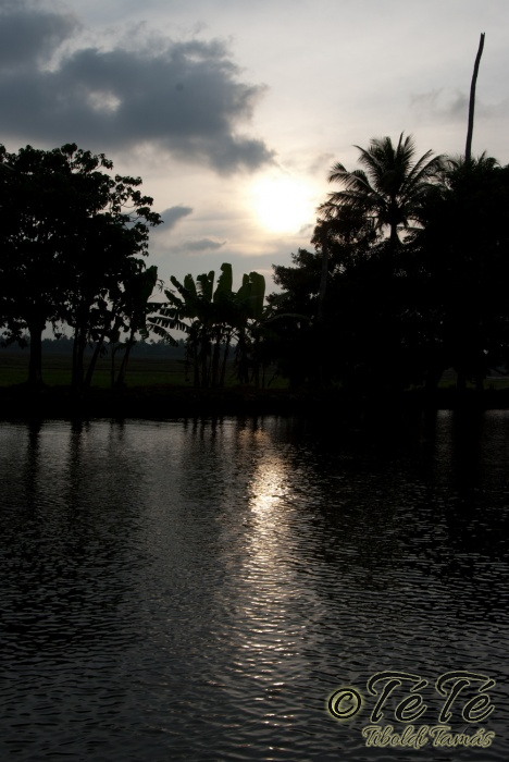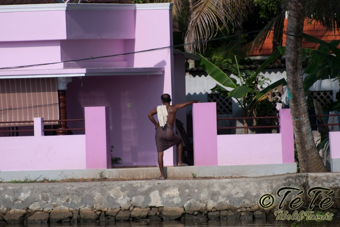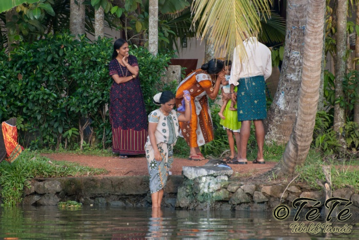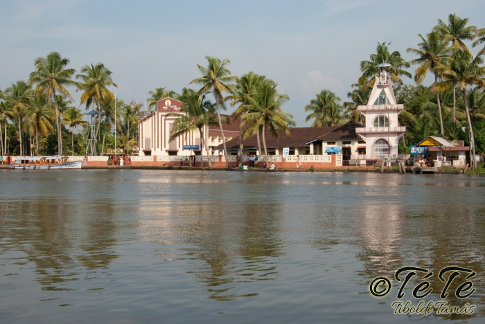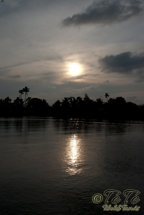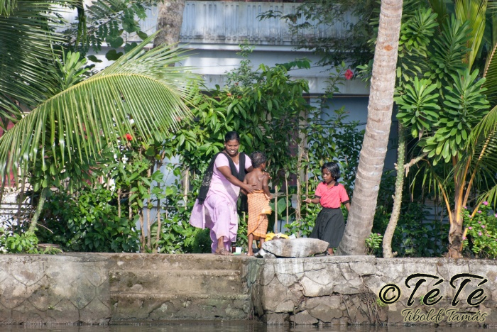 Ahogy elindultunk -és sikeresen kiálltunk a 3 sorban egymáshoz kötött hajók közül- tisztára Poirot érzése volt mindannyiunknak. Poirot, halál a Níluson. Reménykedtünk, hogy reggelinél nem kell majd nyomozni, hogy ki tünt el :) Már nagyjából ismert közegben hajzótunk, a tegnap megismert csatornarendszer vastagabb ágain, tavain. Ebédhez kikötöttünk egy rizsföldön, melyet mivel nem pisiltem körbe, nem nevezüünk TéTéföldnek. De azért ebéd után át tudtam érezni gyarmatosítóink sanyarú sorsát, amikor a rabszolgák hozták a kaját és ők meg csak rámutattak a földre, hogy "Ezt gyarmatositsd". Ebédnél rájöttem, hogy ha akarnak, tudnak főzni. Nem csípsen kértük a kaját és annyira finom volt, hogy csak na. Ebéd után szindítottunk, nézelődtünk, fotóztunk, integettünk, beszélgettünk egész vacsoráig, amit hasonló program követett. Vacsihoz való kikötés után már nem indultunk tovább, ott töltöttünk az éjszakát. így láttuk azt, hogy a partvidék lakói a hazajutáshoz este kénytelenek elemlámpát, telefont, bármi világító eszközt igénybe venni, mert közvilágítás nincs. Nemsokkal az után, hogy megszoktuk éjszakai szálláshelyünk és a szomszéd houseboat-okat, elkezdett cseperegni az eső, majd villámlott, és vihr lett. Jó volt a fedett hajóból nézni az esőt és a folyót. Pláne, miután egy villámlás következtében csak a houseboat-ok világitása maradt meg, mindenhol máshol áramszünet lett... (a kisebb nagyobb áramszünet Kerala megyében elég megszokott a nap bármely szakában)