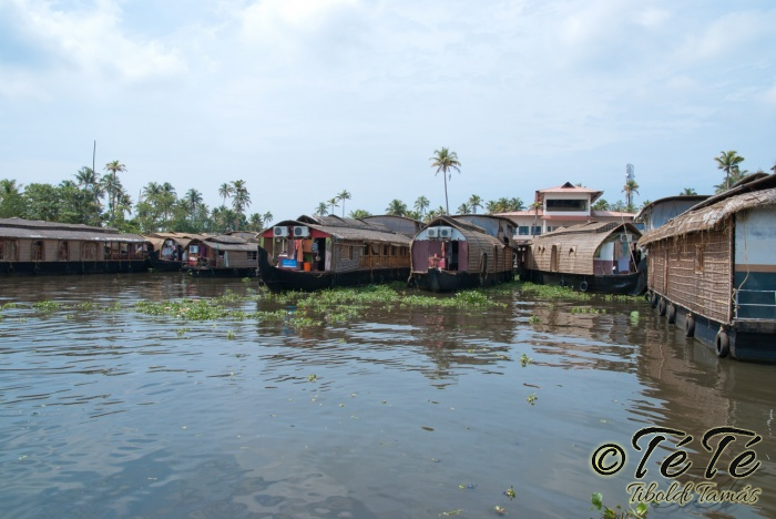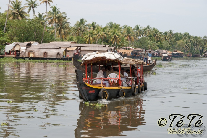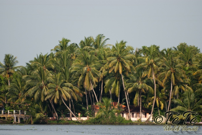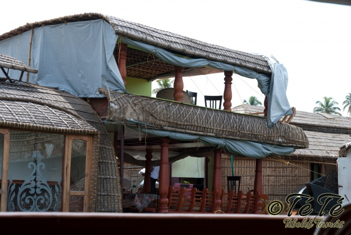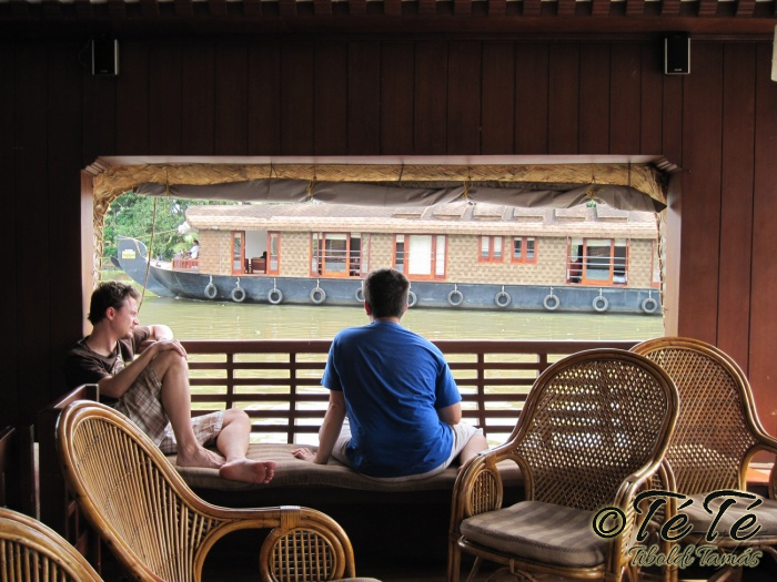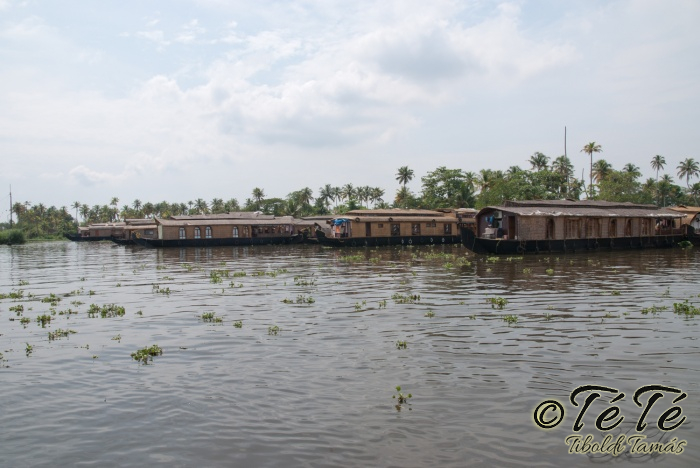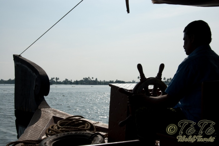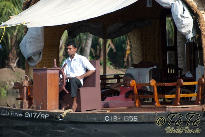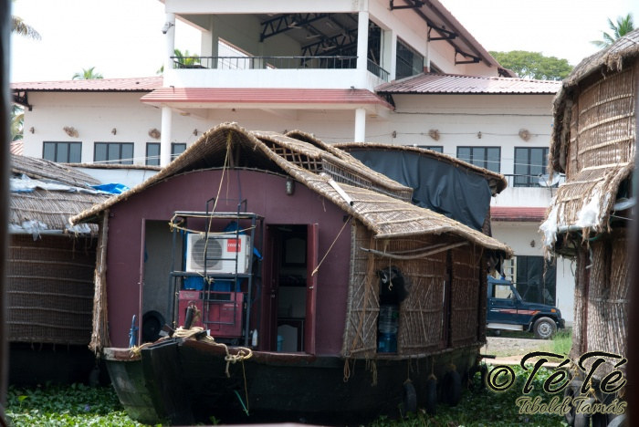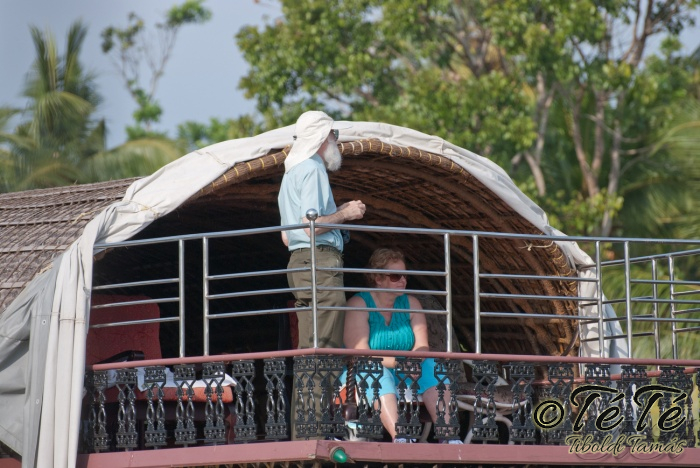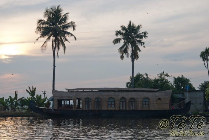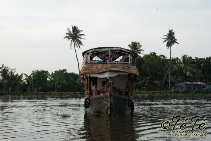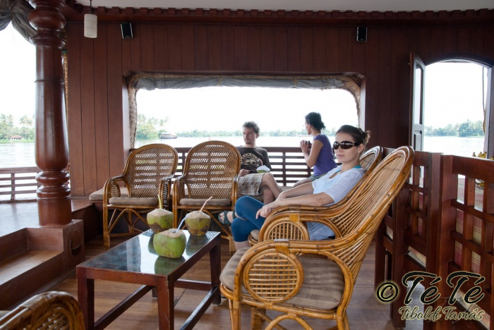 Ez a napvolt az igazi lazulás napja. Reggel felkelés után, a változatosság kedvéért autóztunk egy keveset. vagy 1-2 órát. Itt egyből a partra hajtottunk, aholis a lakóhajónk várt minket. Felszálltunk, csomagjainkat is felhozták. Egyből kaptuk a kókuszt, benne a szívószállal. Ez most jobb volt, mint a múltkor Mysore-ban, de azért azt a sok levet, ami benne van nem birtuk meginni. Egyet felvágattam, hogy a belsejét is megkóstoljuk. Ekkore megfejtettük, hogy ez az éretlen kókusz, és ha megérik, akkor lesz az, amit otthon lehet venni a bótban. Közben kitöltteték velem a check-in kérdőívet, elég részletesen, majd elindultunk. 3 fő személyzet és 4 fő utas. A houseboat egy olyan hajó, amin 2-3-4 szoba van, a végében egy nagy konyhával, az elején egy nagy terasszal és a kormányos székkel. A teraszon nagy fonott karosszékekben lehet elterülni a kedves utasnak, vagy a korlátnál lévő padon ülni, feküdni. A szobák nem túl nagyok, ágy, és egy külön furdő, zuhanyzóval, WCvel. Nem is kell több. Áramot a hajó külön generátora termel, így nem annyira sokat használtuk. De légkondi volt a szobákban, be is fagysztottak estére. :)
