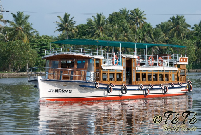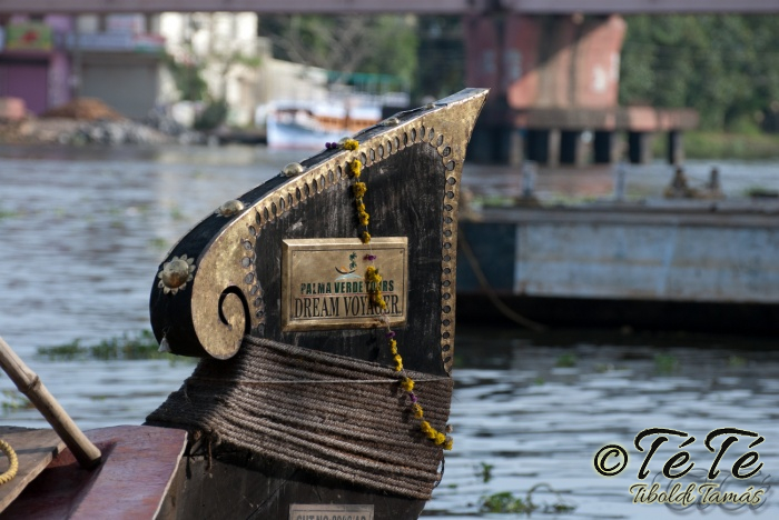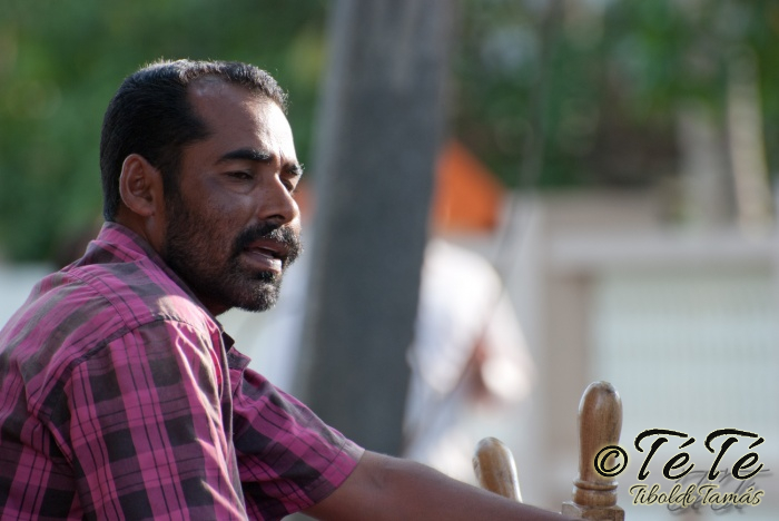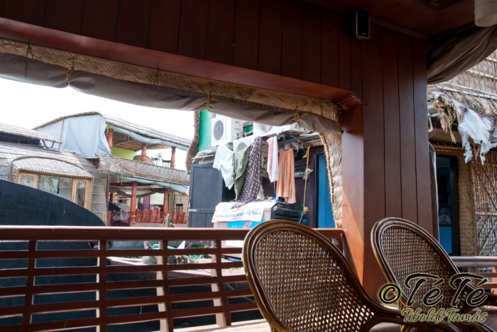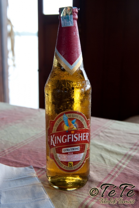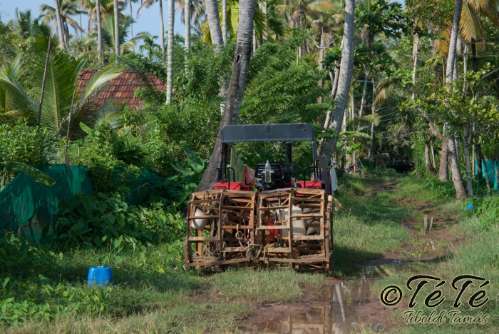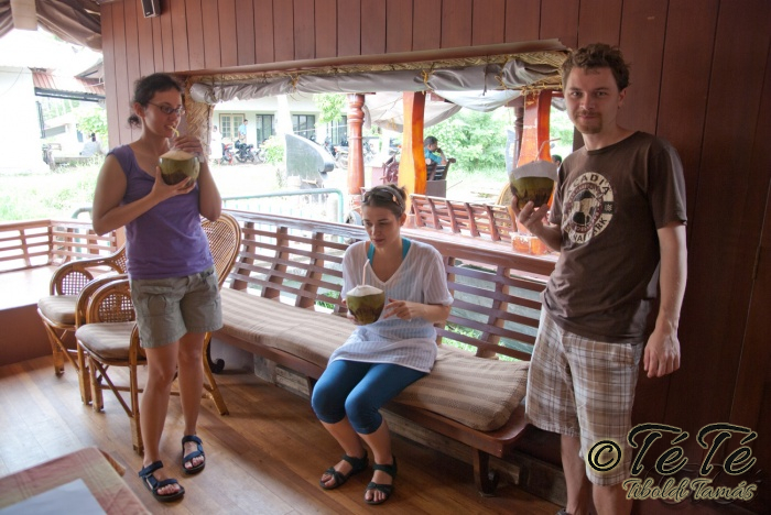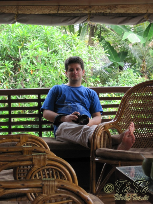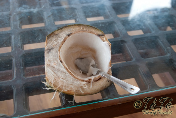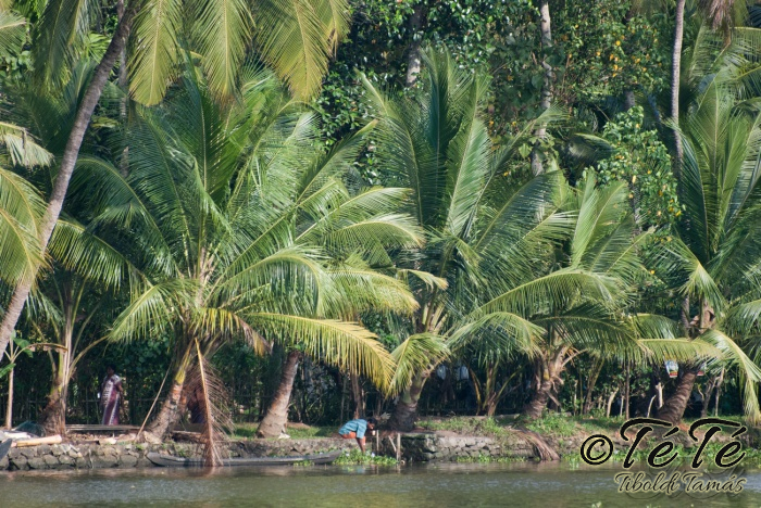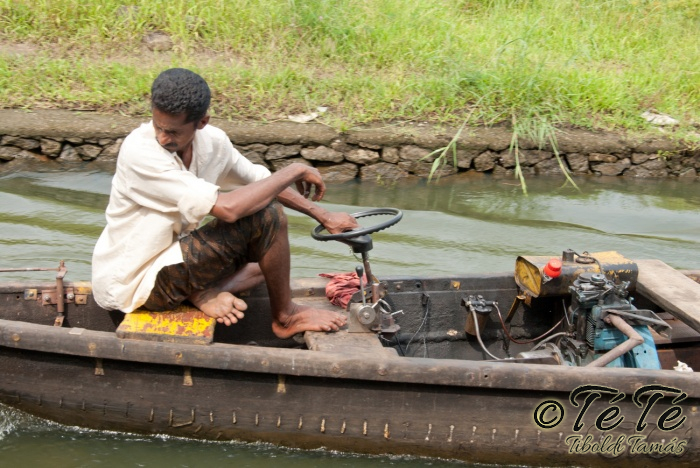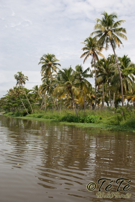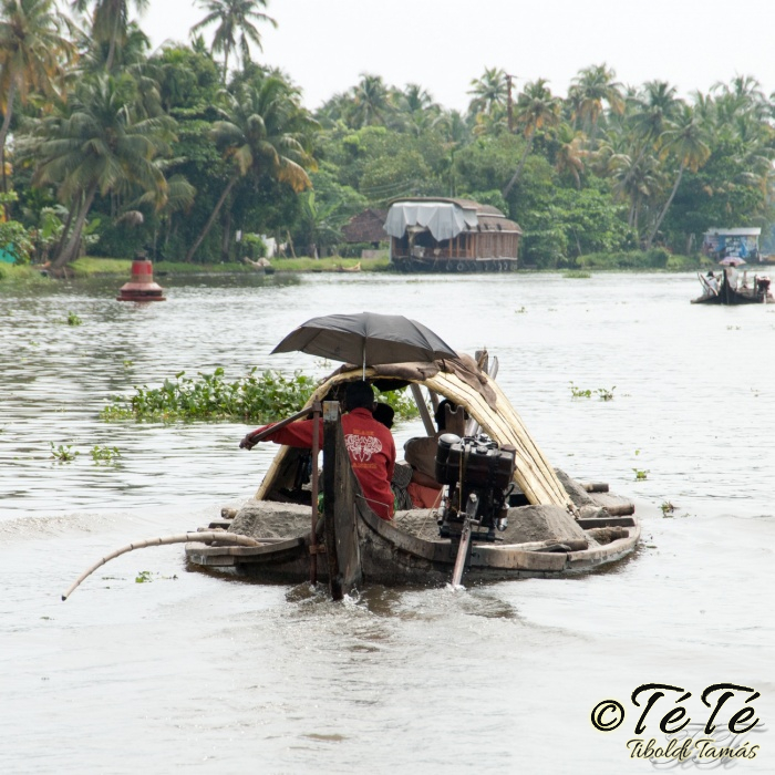 Ez a napvolt az igazi lazulás napja. Reggel felkelés után, a változatosság kedvéért autóztunk egy keveset. vagy 1-2 órát. Itt egyből a partra hajtottunk, aholis a lakóhajónk várt minket. Felszálltunk, csomagjainkat is felhozták. Egyből kaptuk a kókuszt, benne a szívószállal. Ez most jobb volt, mint a múltkor Mysore-ban, de azért azt a sok levet, ami benne van nem birtuk meginni. Egyet felvágattam, hogy a belsejét is megkóstoljuk. Ekkore megfejtettük, hogy ez az éretlen kókusz, és ha megérik, akkor lesz az, amit otthon lehet venni a bótban. Közben kitöltteték velem a check-in kérdőívet, elég részletesen, majd elindultunk. 3 fő személyzet és 4 fő utas. A houseboat egy olyan hajó, amin 2-3-4 szoba van, a végében egy nagy konyhával, az elején egy nagy terasszal és a kormányos székkel. A teraszon nagy fonott karosszékekben lehet elterülni a kedves utasnak, vagy a korlátnál lévő padon ülni, feküdni. A szobák nem túl nagyok, ágy, és egy külön furdő, zuhanyzóval, WCvel. Nem is kell több. Áramot a hajó külön generátora termel, így nem annyira sokat használtuk. De légkondi volt a szobákban, be is fagysztottak estére. :)